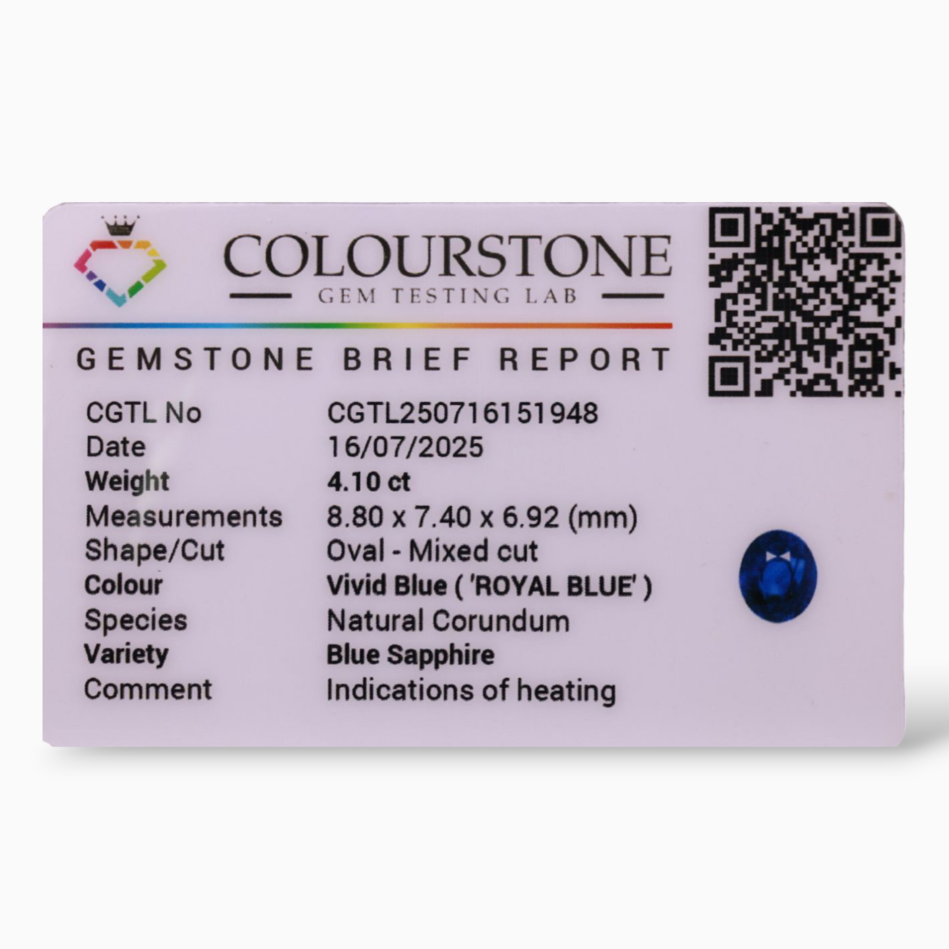 Natural Blue Sapphire 4.10 Carats in Oval Shape & 8.80x7.36x6.89mm Size from Sri lanka